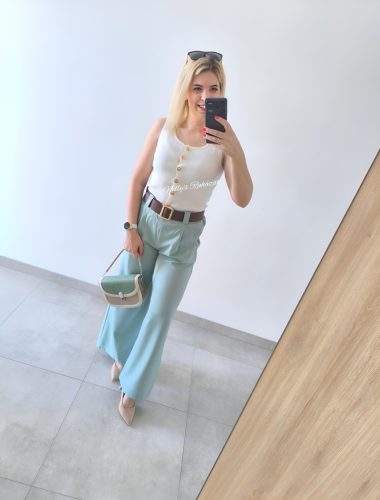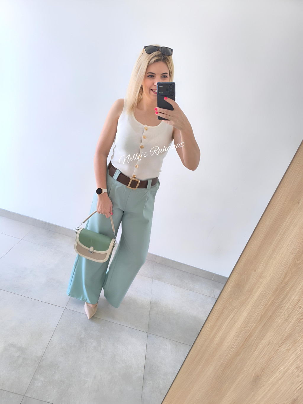 Bőszárú nadrág gyönyörű esésű anyagból készült,magas derekú fazonja pedig optikailag nyújtja az alakot.A hozzá tartozó öv,ami még csinosabbá teszi a megjelenést.