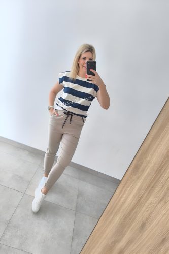Csíkos,sportos póló szuper puha anyagból.Kényelmes viselet a mindennapokra, farmerrel vagy bármilyen más színű nadrággal is szuper választás.