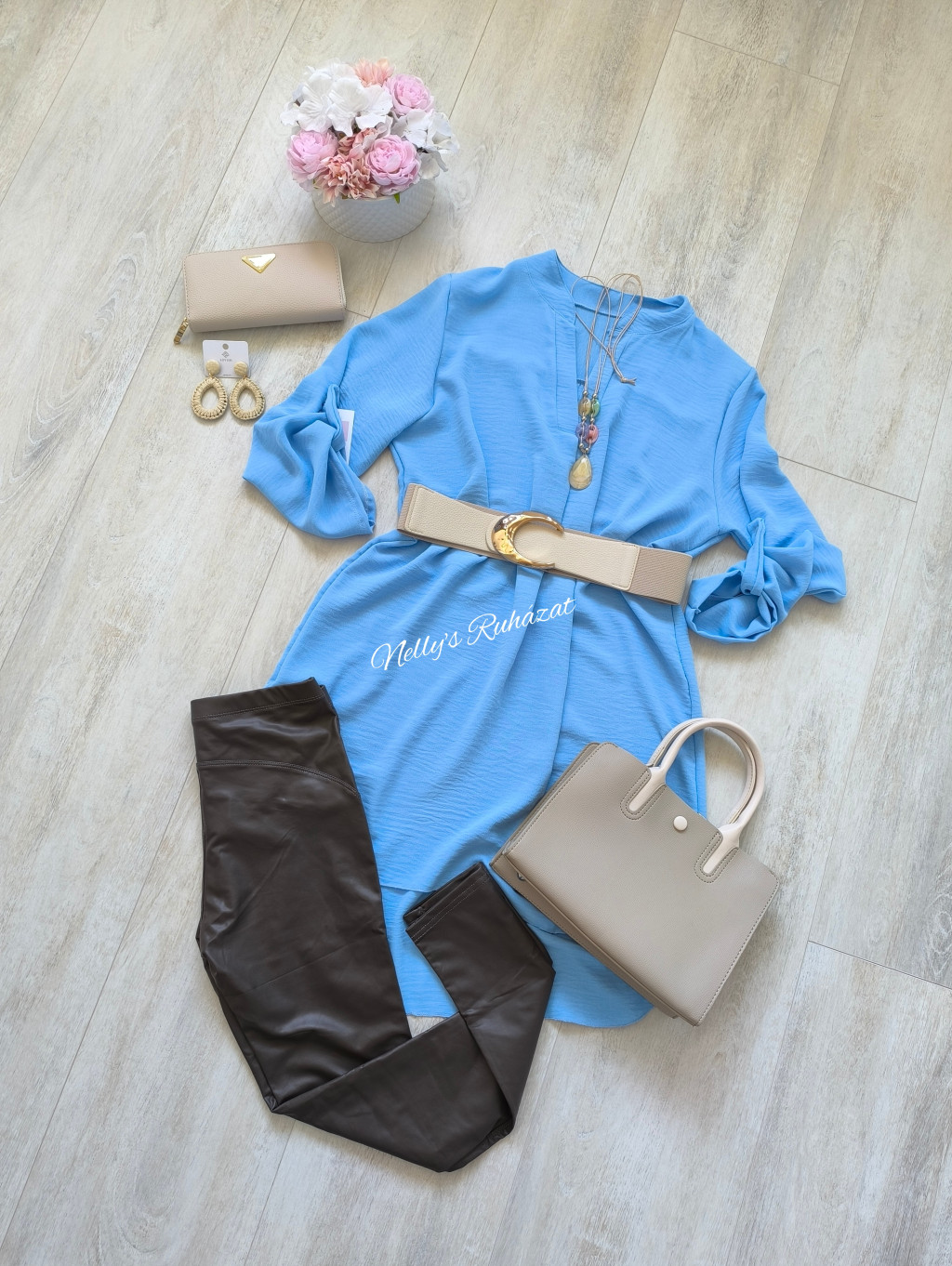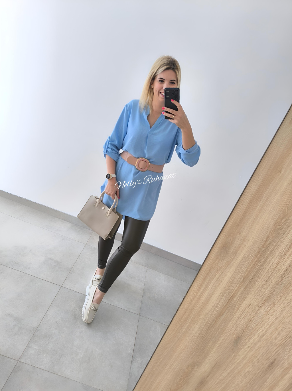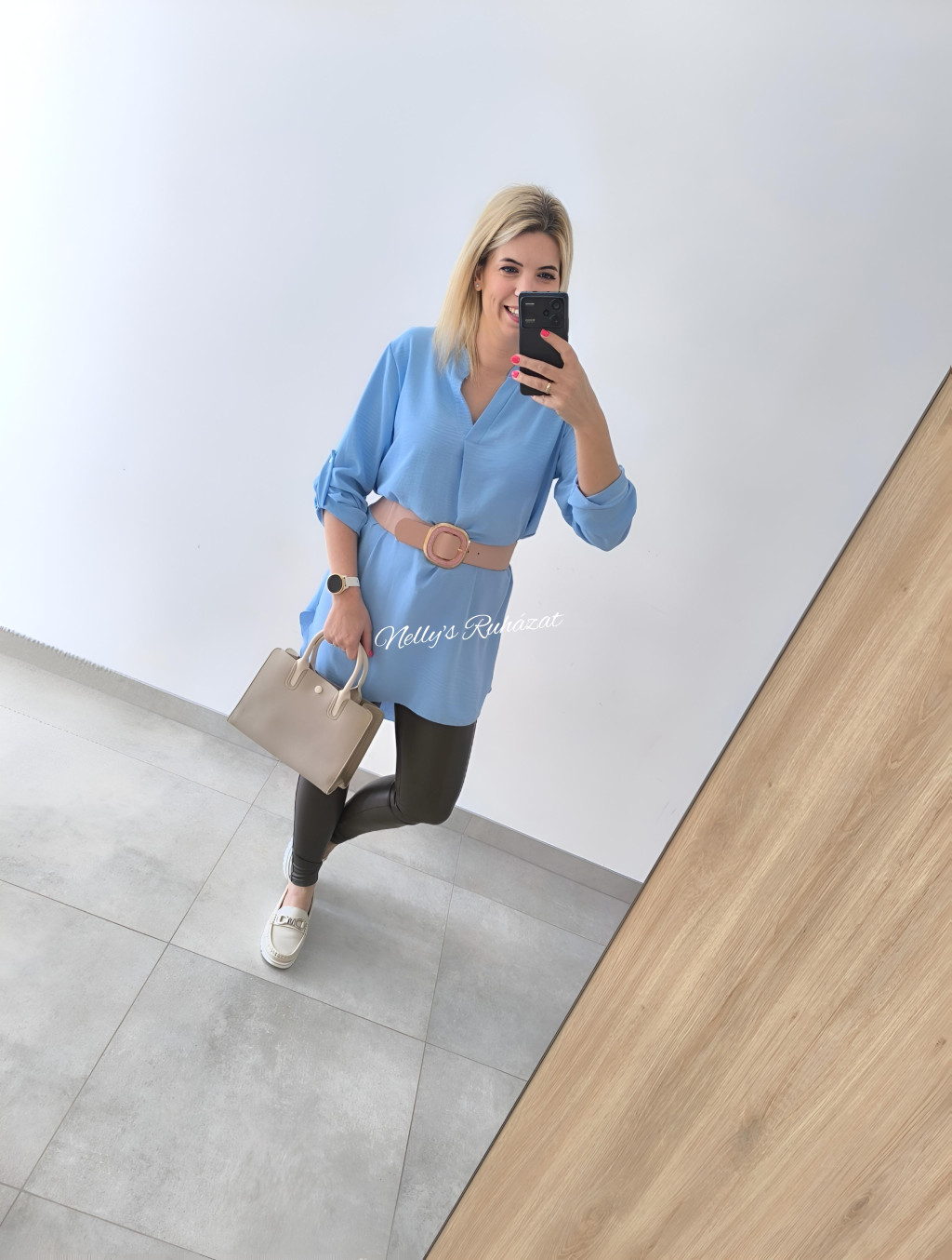 Nőies, ingruha övvel karcsúsítja az alakot,míg hátul hosszított szabása kényelmes viseletet biztosít.3/4 gombolható ujja praktikus,így könnyen alakítható az évszakhoz.