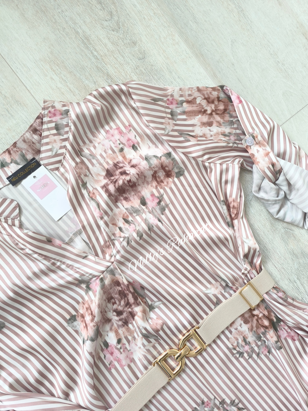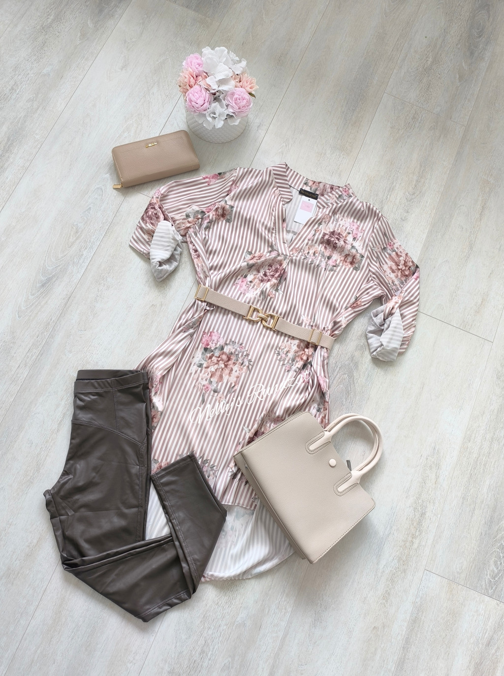 Nőies,virágos ingruha övvel karcsúsítja az alakot,míg hátul hosszított szabása kényelmes viseletet biztosít.3/4 gombolható ujja praktikus,így könnyen alakítható az évszakhoz.