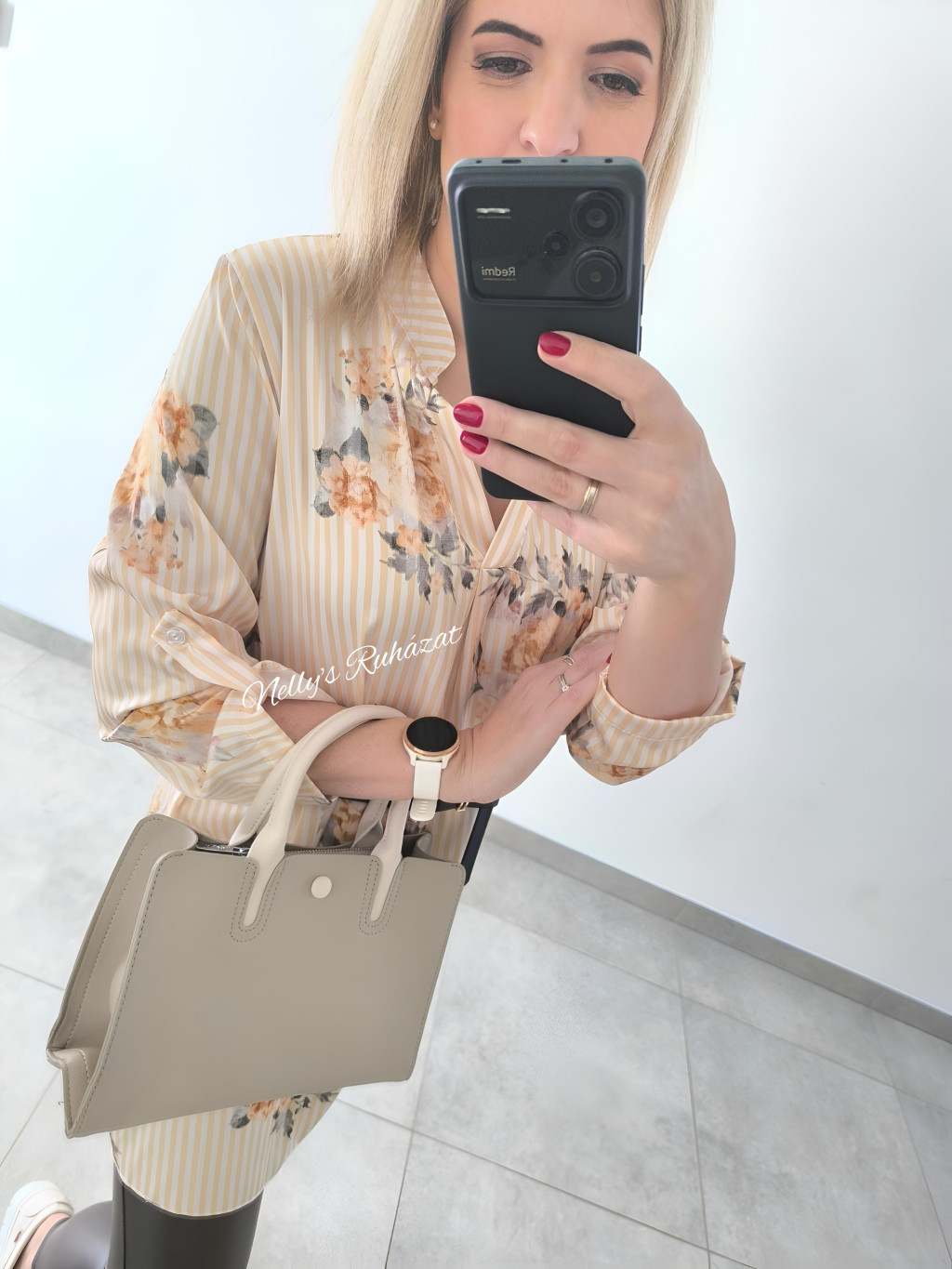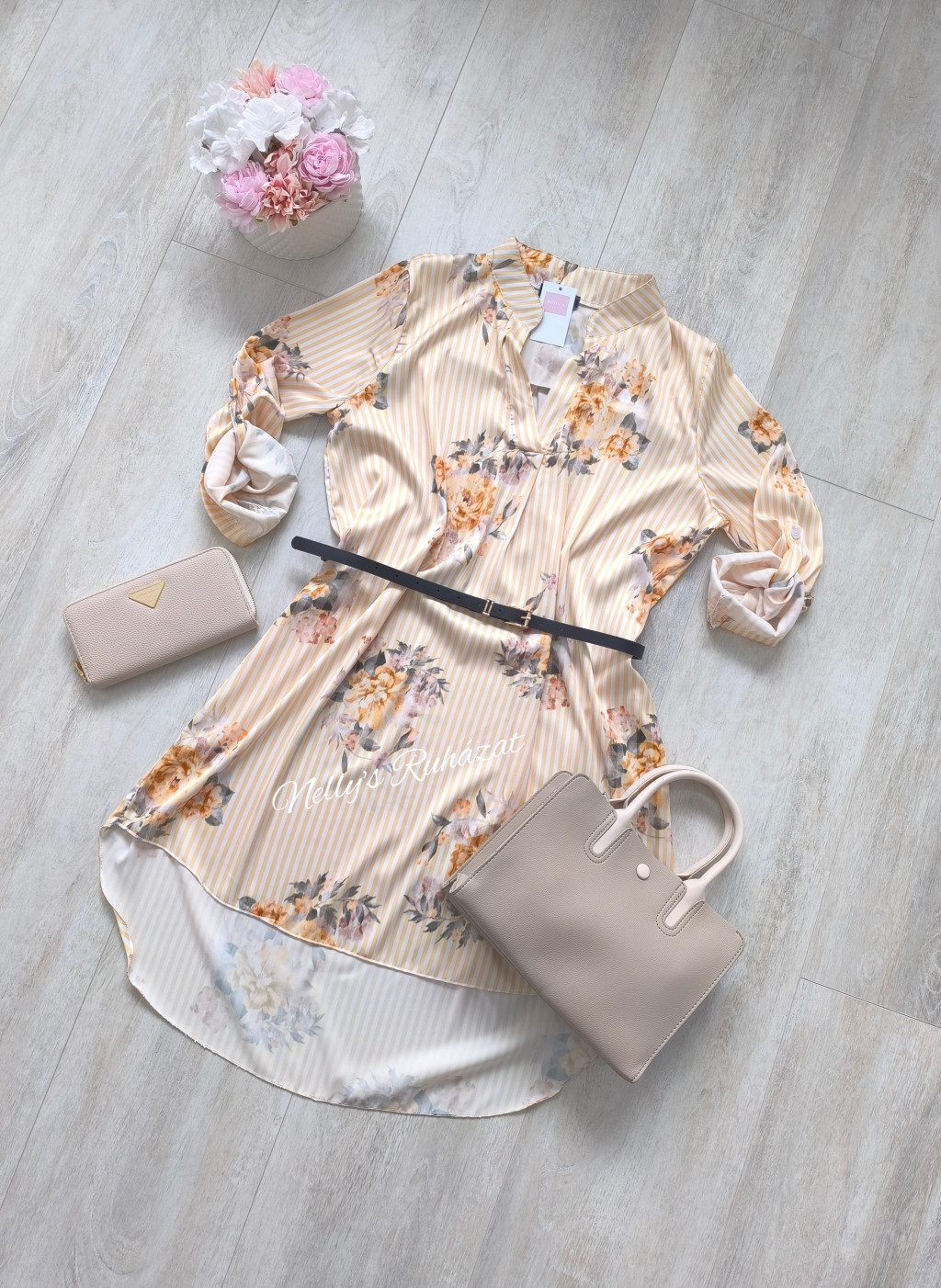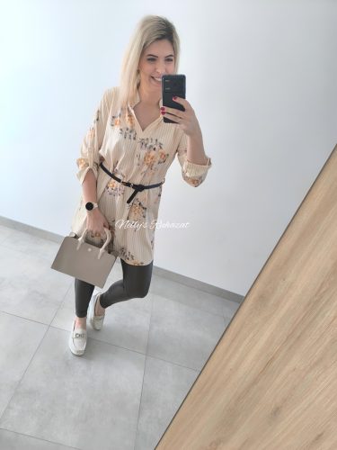 Nőies,virágos ingruha övvel karcsúsítja az alakot,míg hátul hosszított szabása kényelmes viseletet biztosít.3/4 gombolható ujja praktikus,így könnyen alakítható az évszakhoz.
