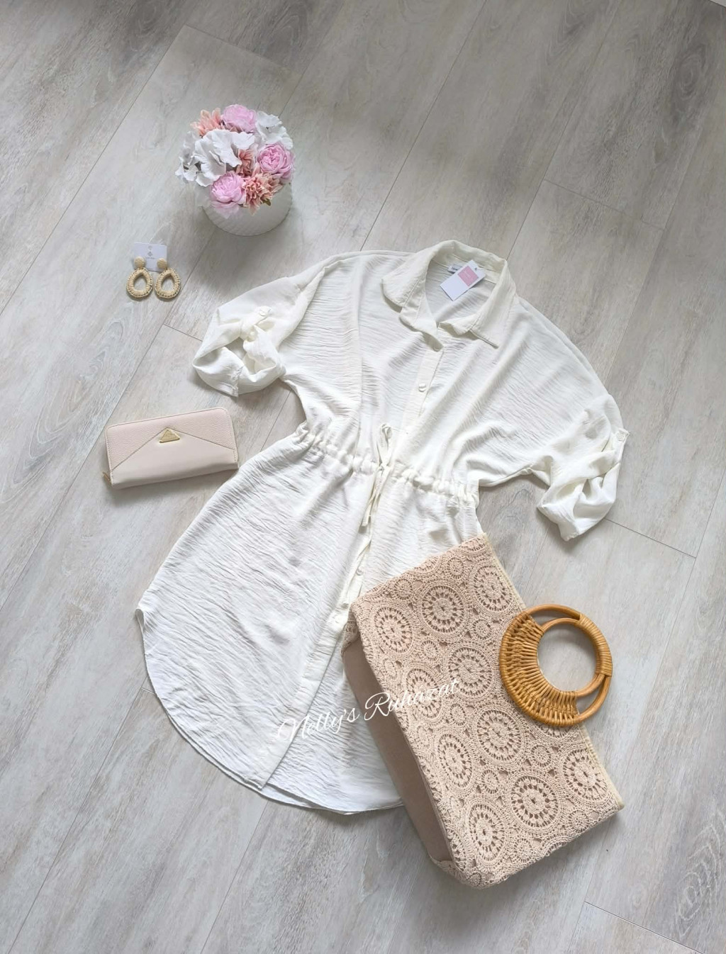 Ez a könnyed, fehér ingruha tökéletes választás a nőies, mégis kényelmes megjelenéshez. Lágy esésű anyaga és derékban húzható szabása finoman kiemeli az alakot, ideális hétköznapi és alkalmi viselethez is.