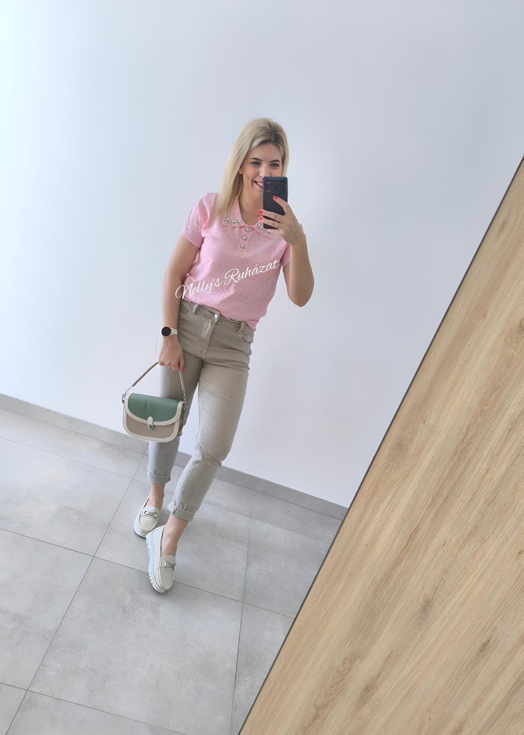 Rövid ujjú felső könnyű,légies anyagból készült,amely egész napos kényelmet biztosít.A finoman elhelyezett köves díszités nyak résznél elegáns,nőis megjelenést add.Könnyen kombinálható nadrággal vagy szoknyával is.