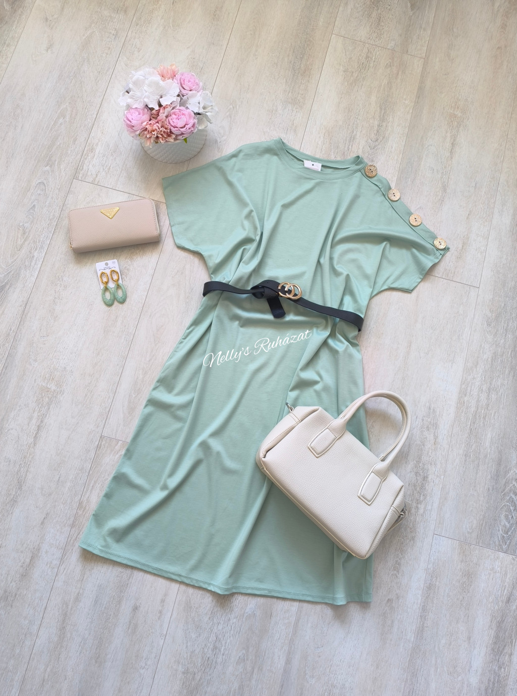 Rövid ujjú,puha anyagú ruha vállrésznél díszgombbal,kényelmes és csinos megjelenést ad.