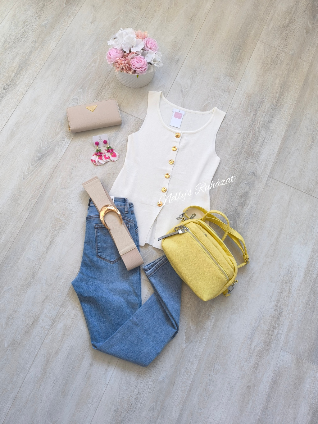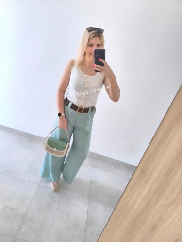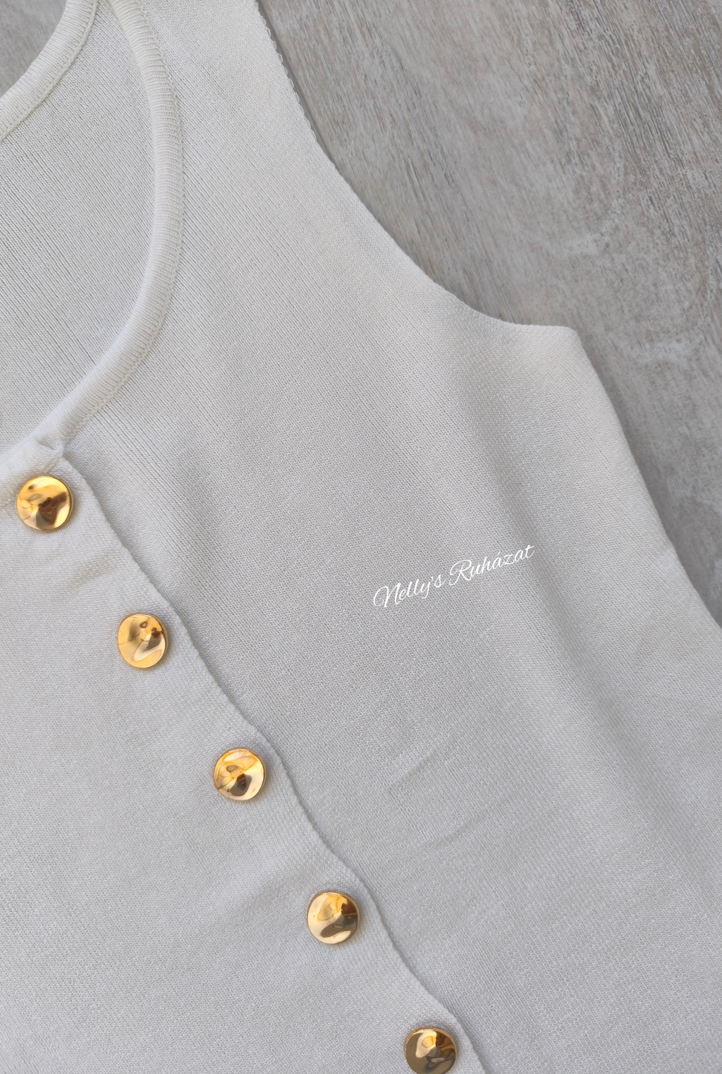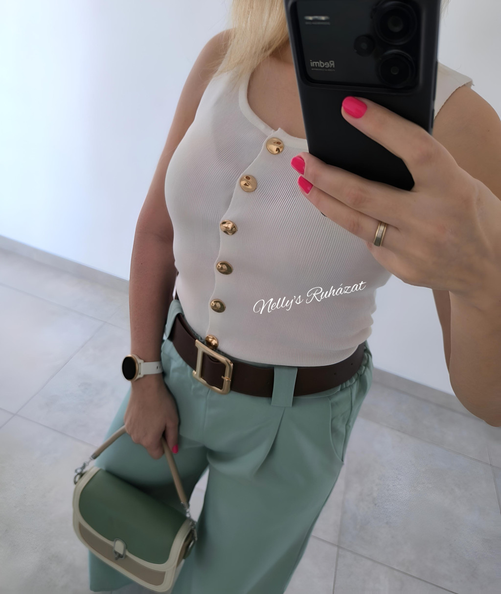 Csinos tavaszi-nyári ujjatlan felső  gombos díszítéssel.Különleges darab,tökéletes választás farmerrel vagy csinos nadrággal kombinálva is.