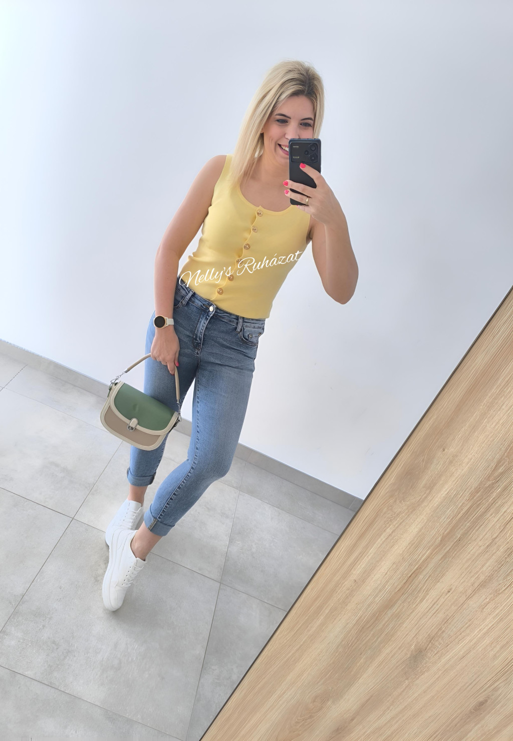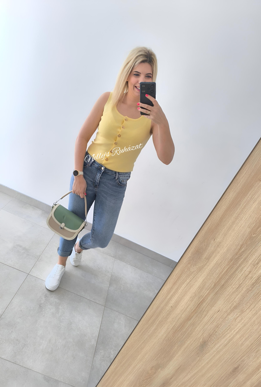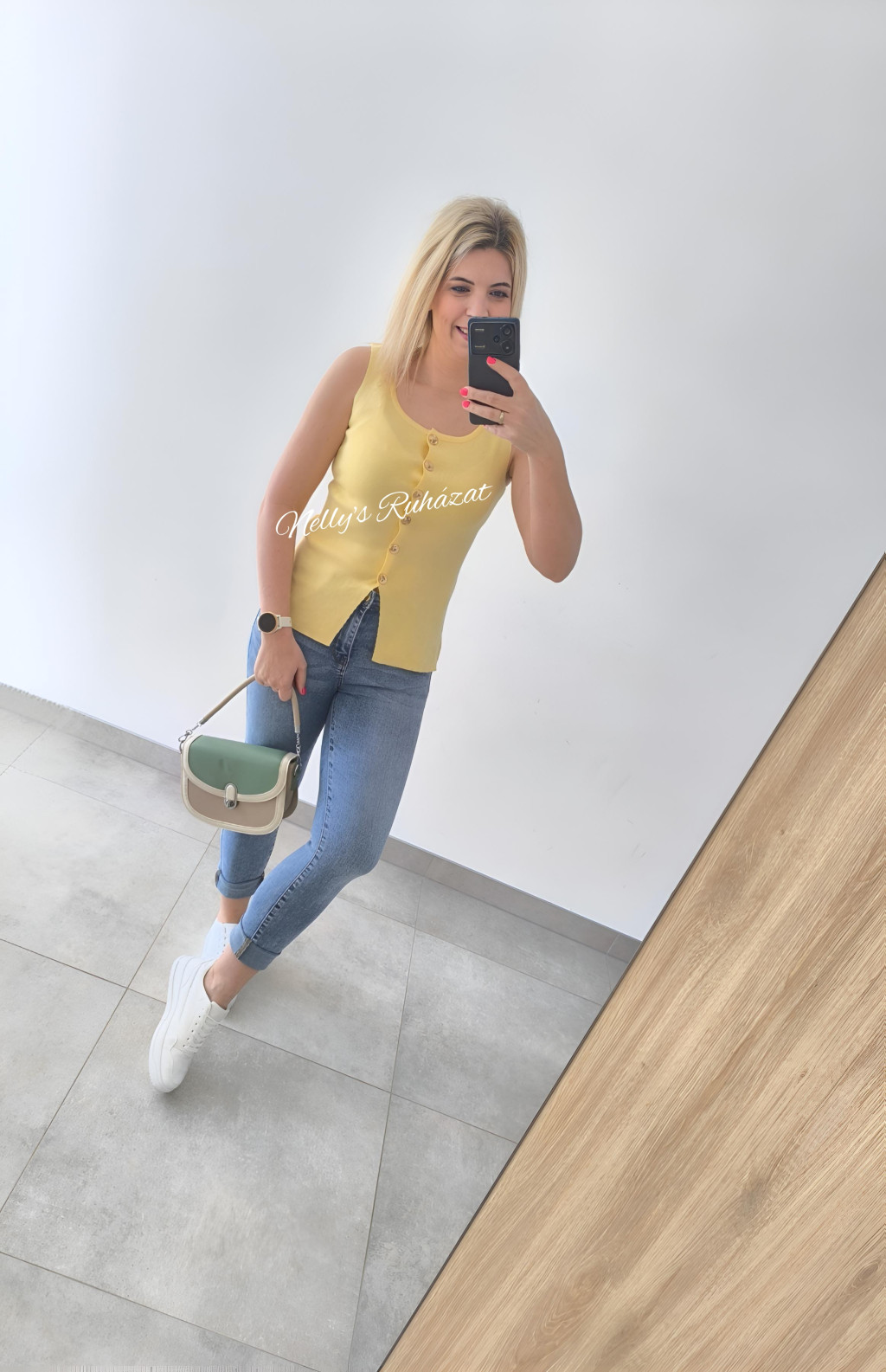Csinos tavaszi-nyári ujjatlan felső  gombos díszítéssel.Különleges darab,tökéletes választás farmerrel vagy csinos nadrággal kombinálva is.